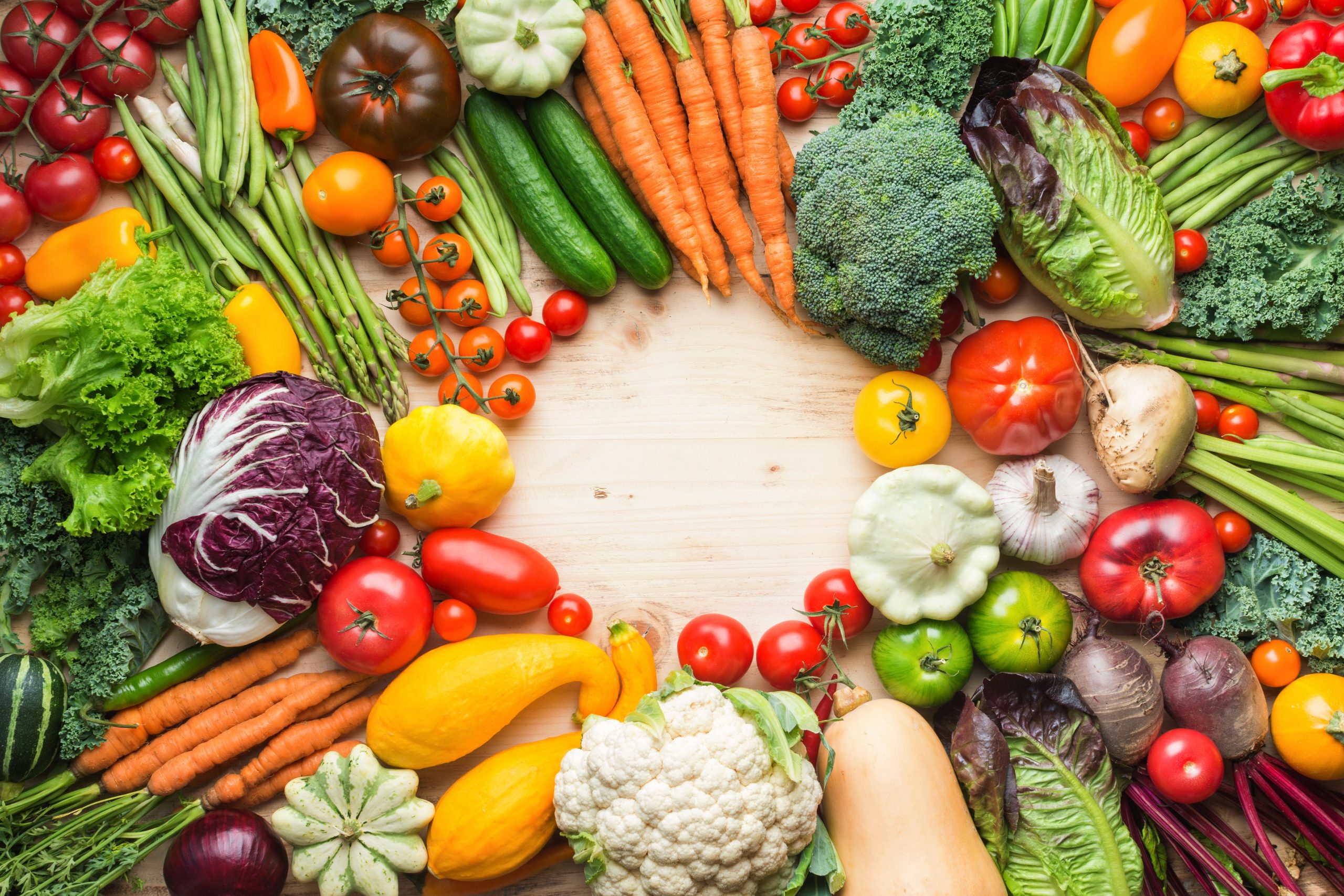 Fresh farm produce, colorful vegetables on wooden pine table, healthy background, copy space for text in the middle, top view, vertical, selective focus 출처:HQTS 2023-01-04