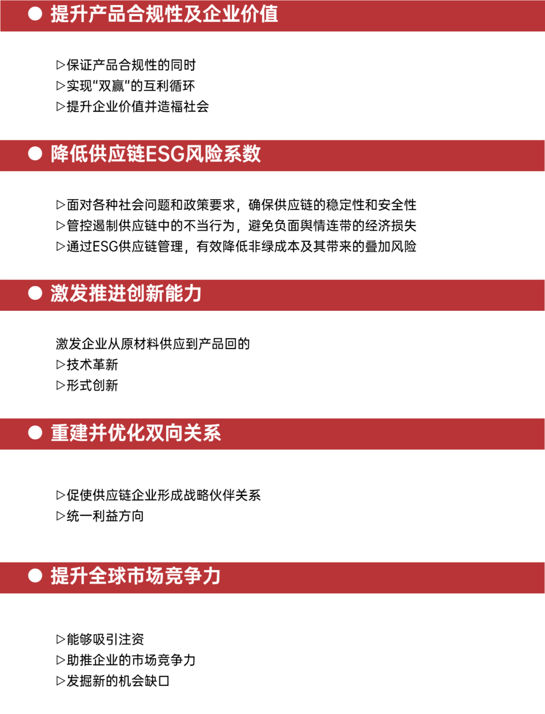 ESG 공급망 관리는 전통적인 공급망 관리 차원에 ESG 요소를 추가하는 것 입니다 . 예를 들어 공급업체의 지배 구조, 직원 혜택, 이해관계자 관리, 탄소 배출, 환경 혜택 및 위기 관리 등에 대한 더 많은 검증 요구 사항을 제시합니다.
