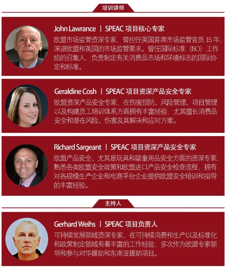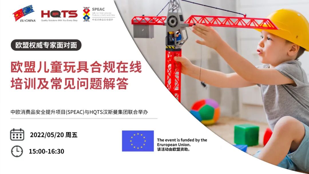 EU 내 어린이 장난감의 안전 위험 관리와 관련하여 EU 정의 및 소비자 보호 사무국이 주도하고 자금을 지원하는 중국-유럽 소비자 제품 안전 개선 프로젝트(SPEAC)와 HQTS Group이 공동으로 “EU 어린이 제품 안전 개선 프로젝트”를 조직했습니다 . 장난감 규정 준수 온라인 교육 및 FAQ” “회의”를 통해 EU의 권위 있는 전문가와 직접 만나 어린이용 장난감 제품을 EU로 수출하기 위한 보다 실용적인 솔루션을 제공할 수 있습니다.