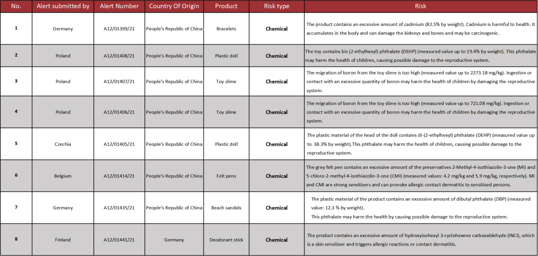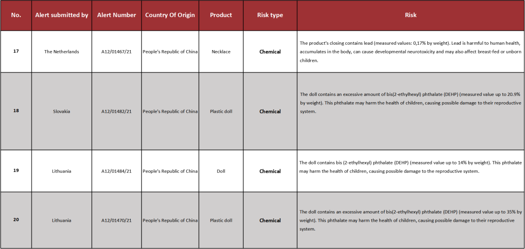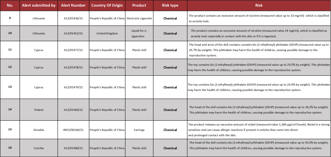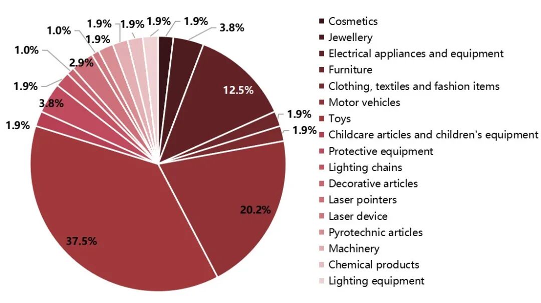 2021년 10월 EU RAPEX 조기경보 고시에는 총 17개 품목 104개 품목이 포함되며 , 고시 품목은 주로 장난감(39건), 자동차(21건), 전자·전기장비(13건)에 집중돼 있다. 신고된 품목 중 원산지는 중국(63건)으로 60.6%를 차지한다. 주요 위험 유형은 화학적 상해(24건)와 신체적 상해(21건)이며, 그 중 화학적 상해가 23.1%를 차지하며, 아래 그림은 리콜 품목별 비율을 반영한 것입니다.