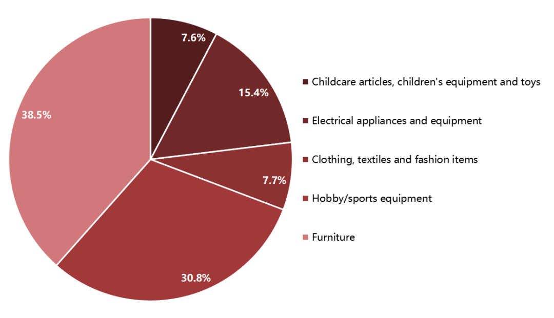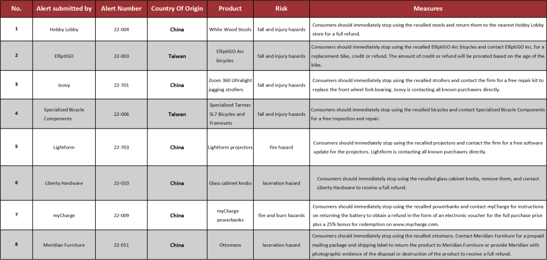 2021년 10월 미국 CPSC는 6개 카테고리 총 13개 제품을 리콜했다 . 가장 많은 리콜이 발생한 세 가지 제품 범주는 가구(5건), 엔터테인먼트 및 스포츠 장비(4건), 전자 및 전기 장비(2건)입니다. 리콜 대상 제품 중 원산지는 중국(6건)으로 46.2%를 차지하며, 가장 중요한 위험 유형은 낙상으로 인한 부상 위험, 열상 위험에 집중돼 있다. 이 중 낙상으로 인한 부상 가능성이 있는 비율은 30.8%로, 아래 수치는 리콜 대상 품목별 비율을 반영한 것입니다.
