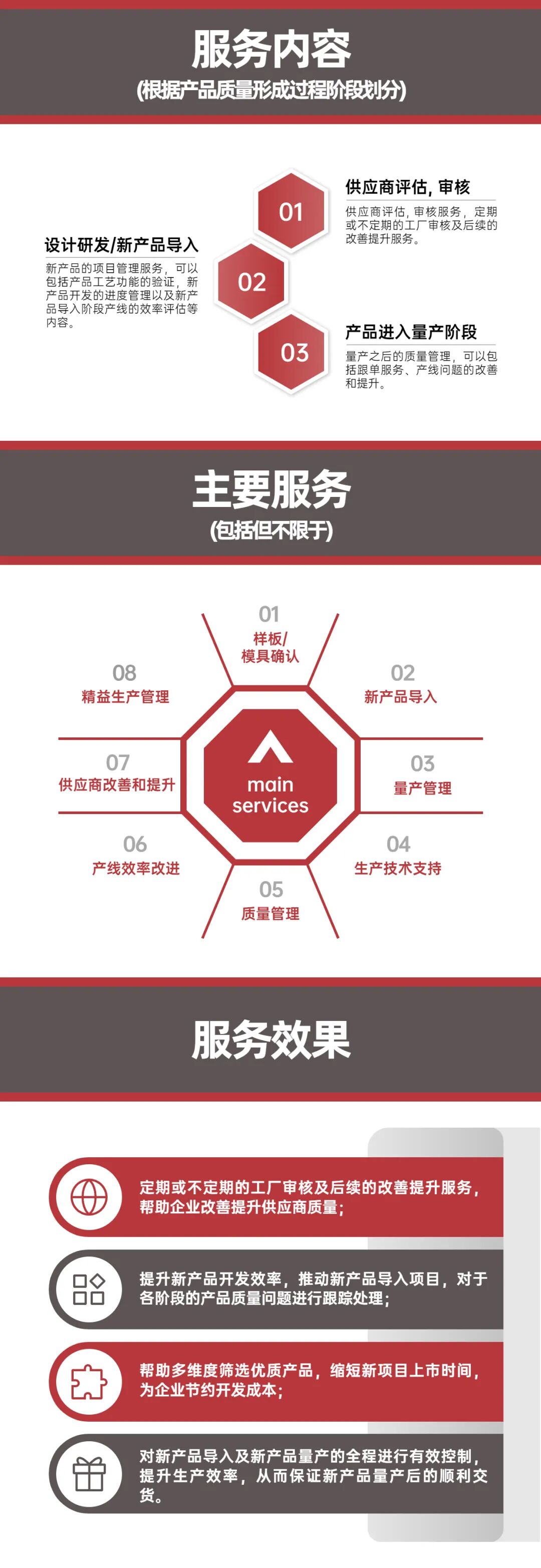 브랜드 오너든, 공급업체든, 신제품 설계, 검증, 시험생산, 대량생산 과정에서 제품 품질이 불안정하거나, 납품이 되지 않는 등 품질에 문제가 있는 경우, 문의주시면 상담 가능합니다. 우리는 귀하에게 가장 적합한 공급업체 품질 엔지니어를 연결하고 가장 효율적이고 전문적이며 유연한 SQE 서비스를 제공할 것입니다. 상담 핫라인: 400-888-1563 .
